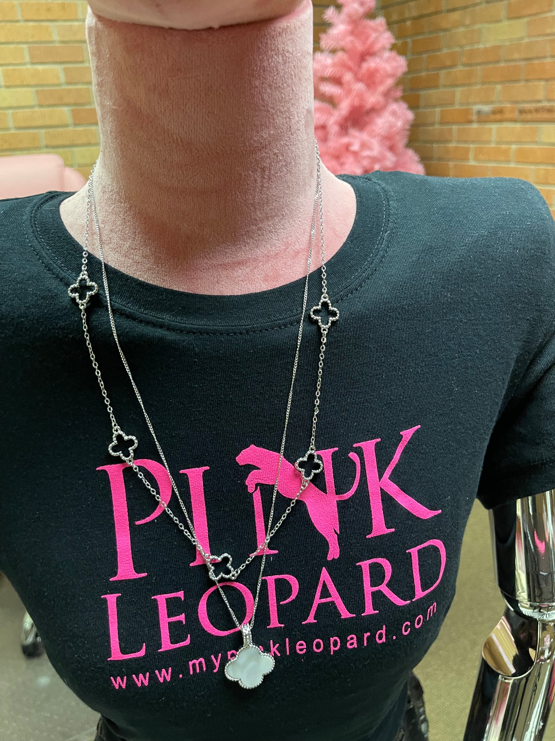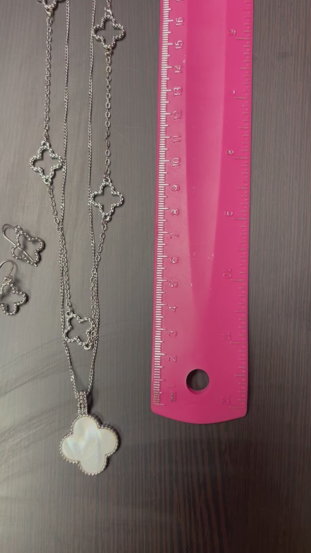 It’s a classic.Have fun with it! Silver tone. Cream colored clover. Layered necklace. Earrings included. 22.5 inches long. Item #778 #mypinkleopard #itsalifestyle #est2013