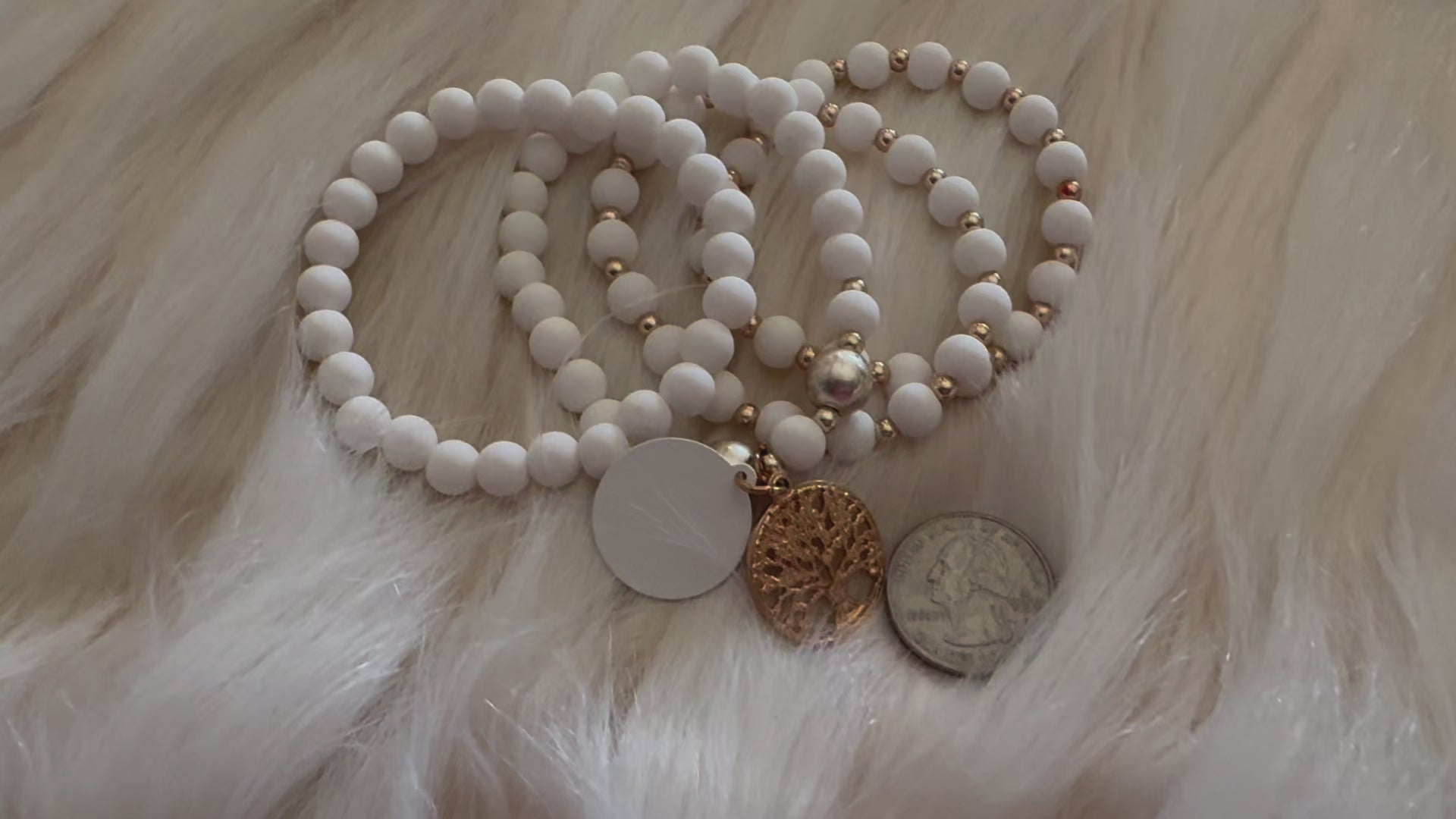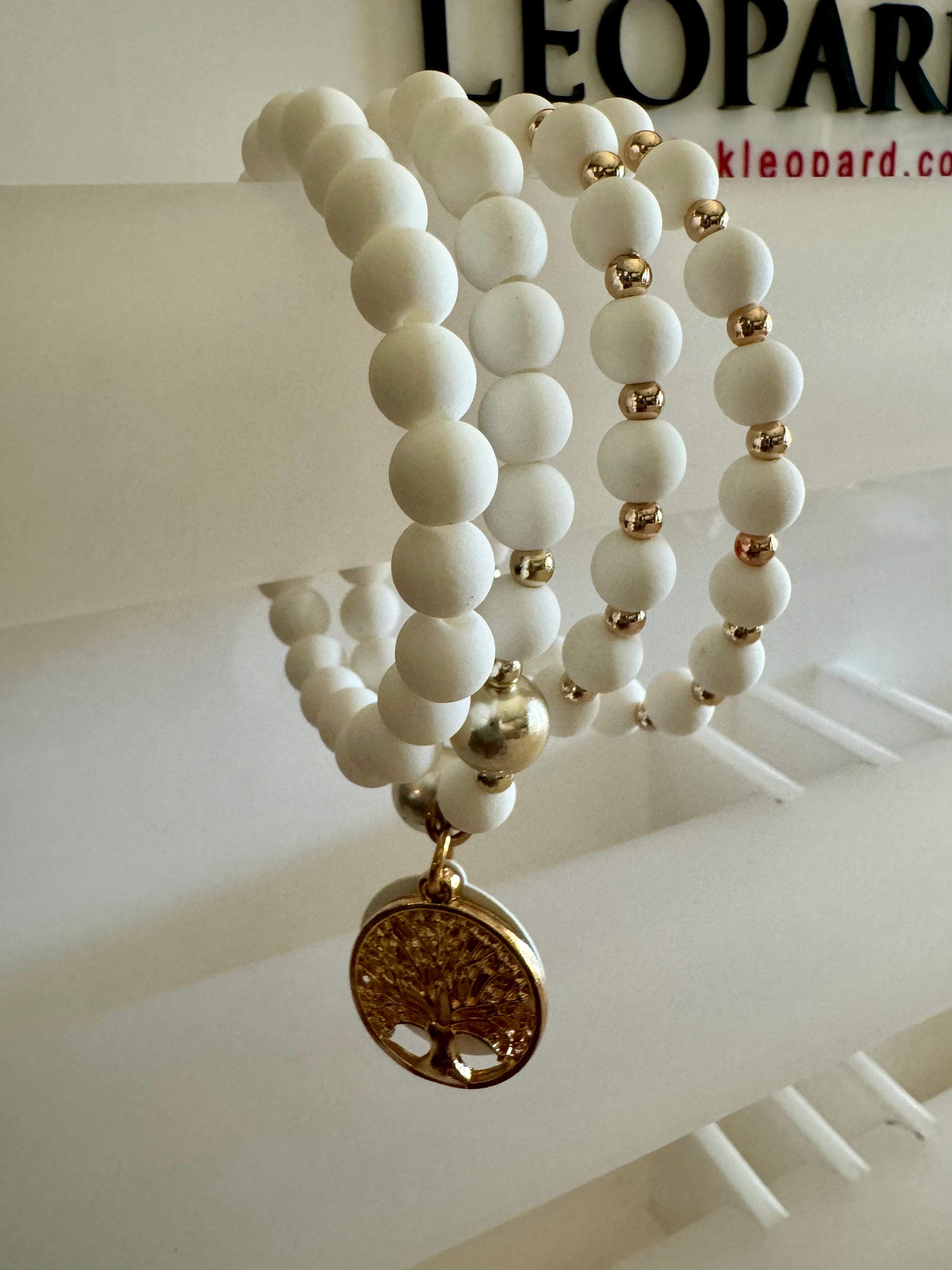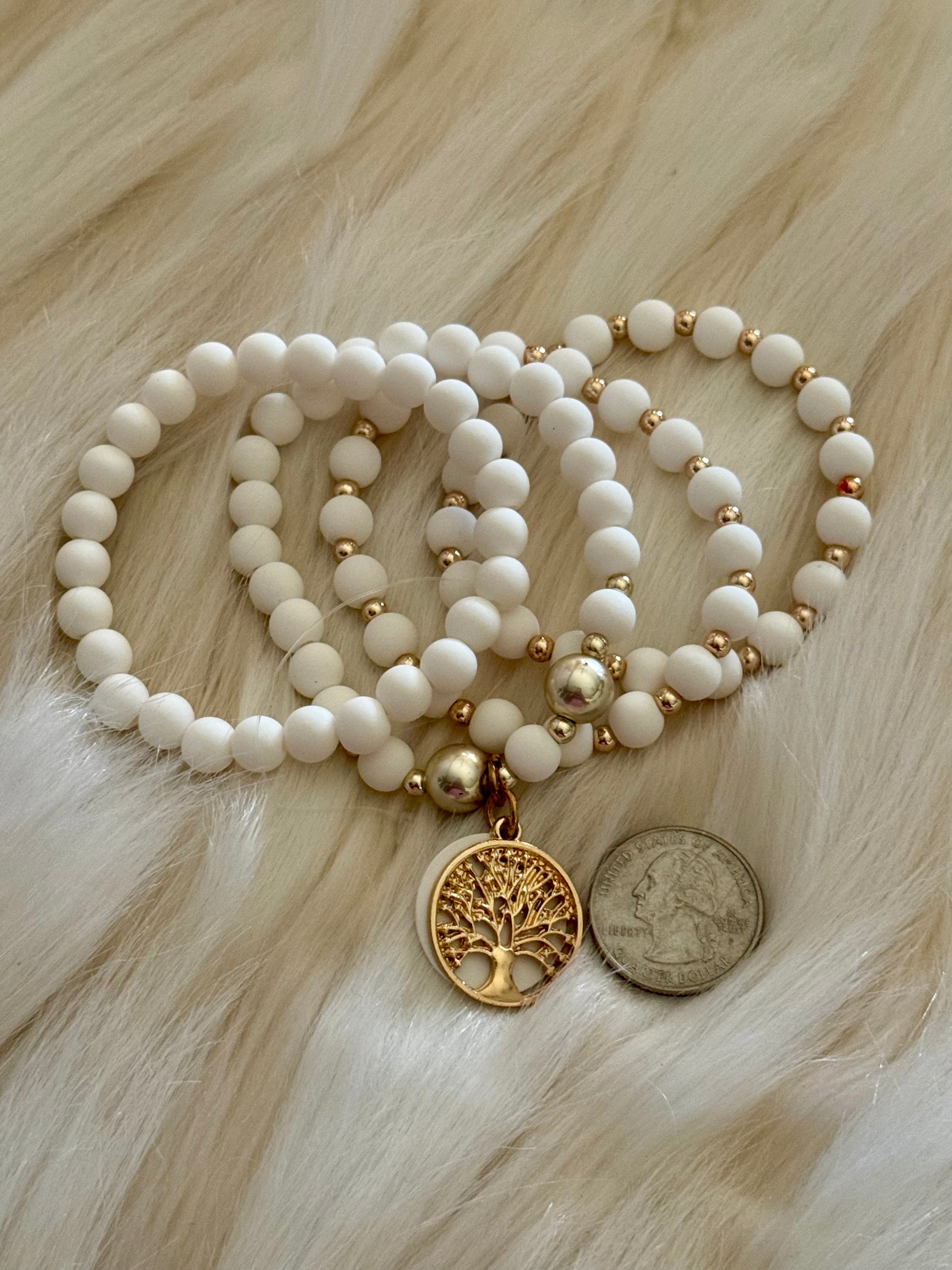 Life is definitely what YOU make of it. Remind yourself of that with this beaded stretch bracelet. Tree of life. FOUR bracelets total. The beads are white matte. Gold tone accents. #781