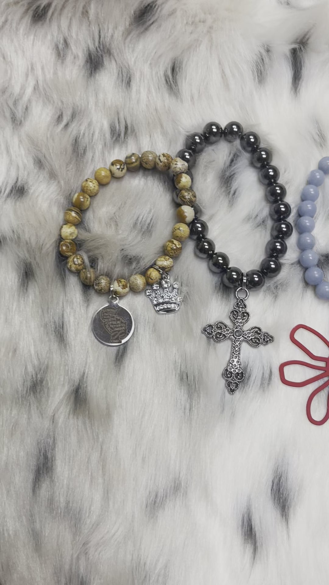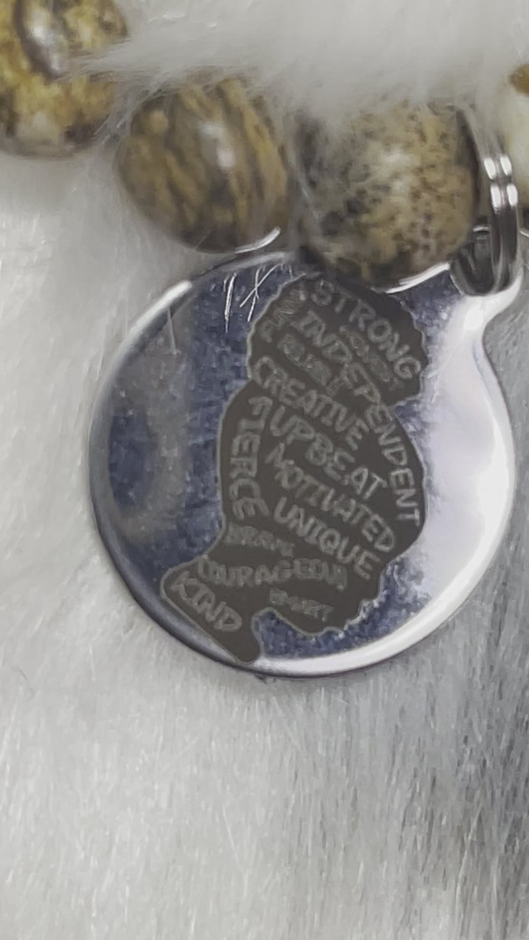 There are two charms on this bracelet One is of a female, the words on the charm says: Strong, Independent, Creative, Upbeat, Motivated, Unique, Fierce, Brave, Courageous, Smart, Kind.