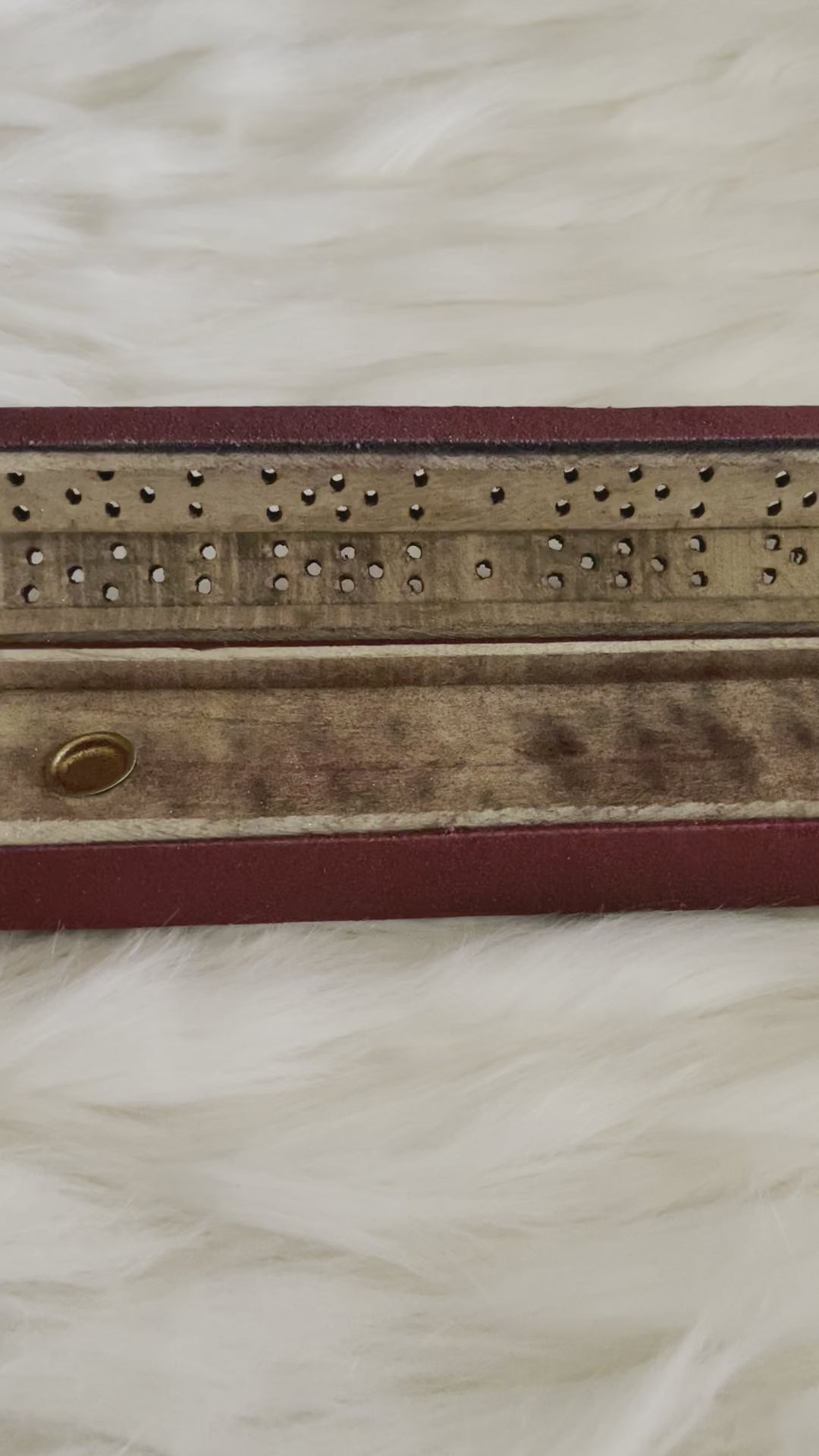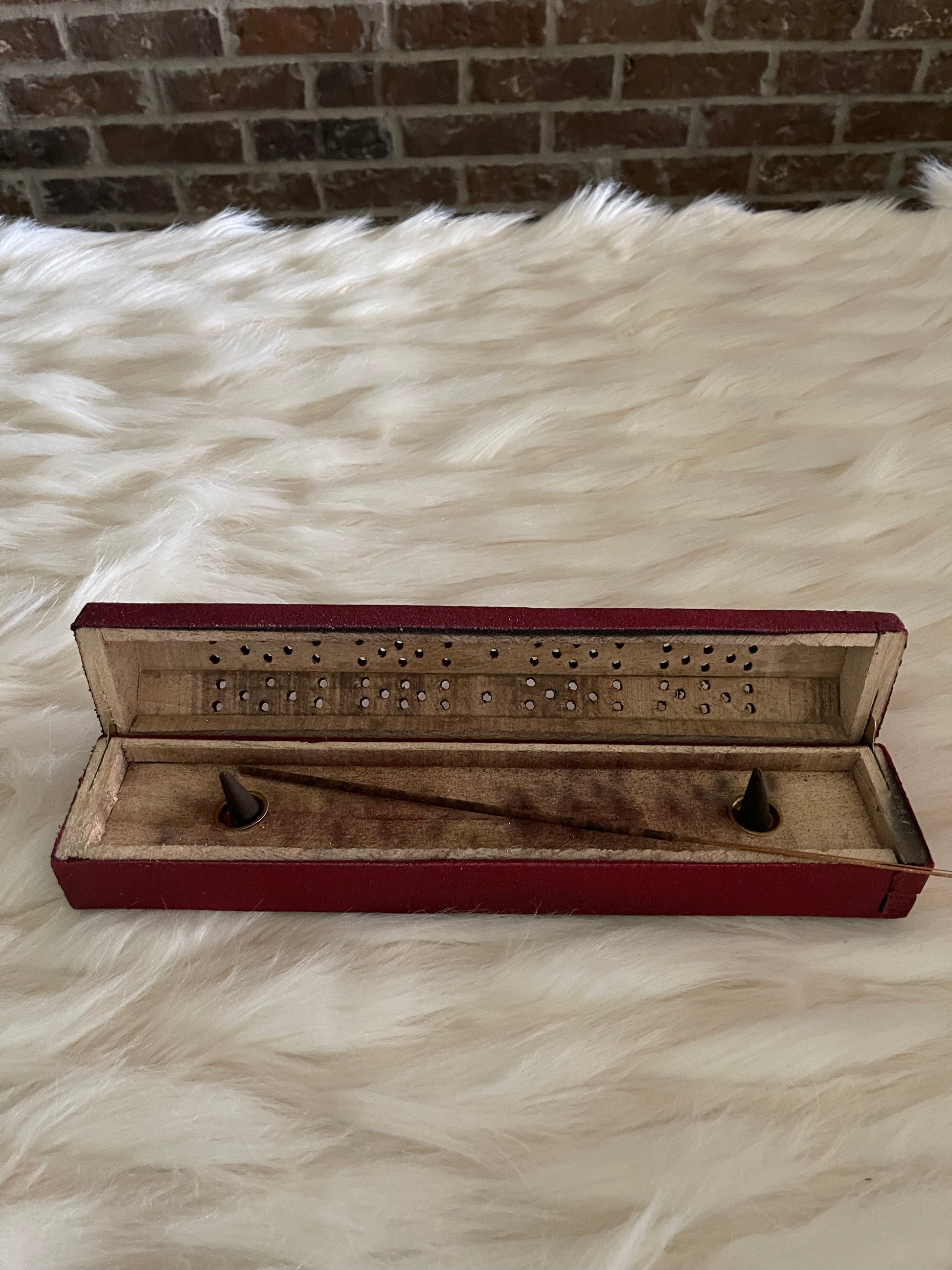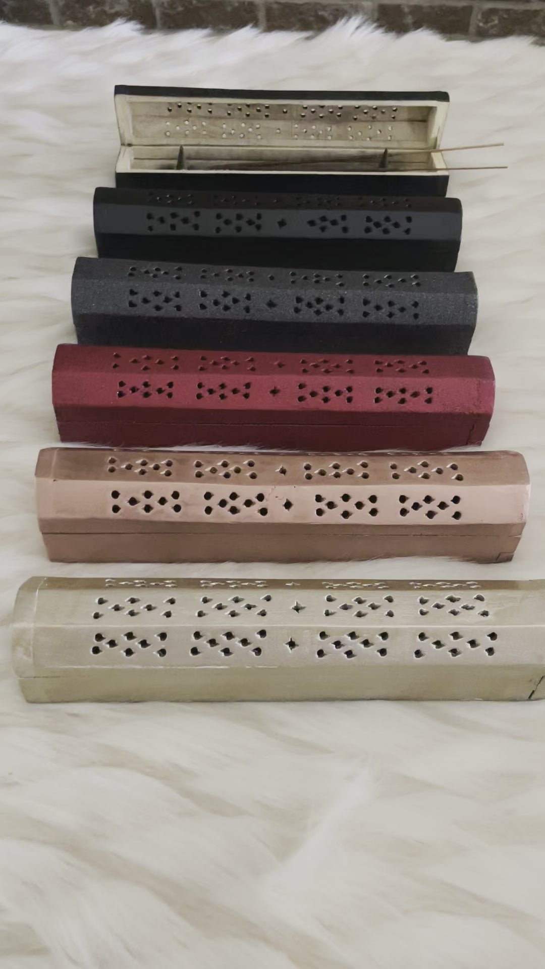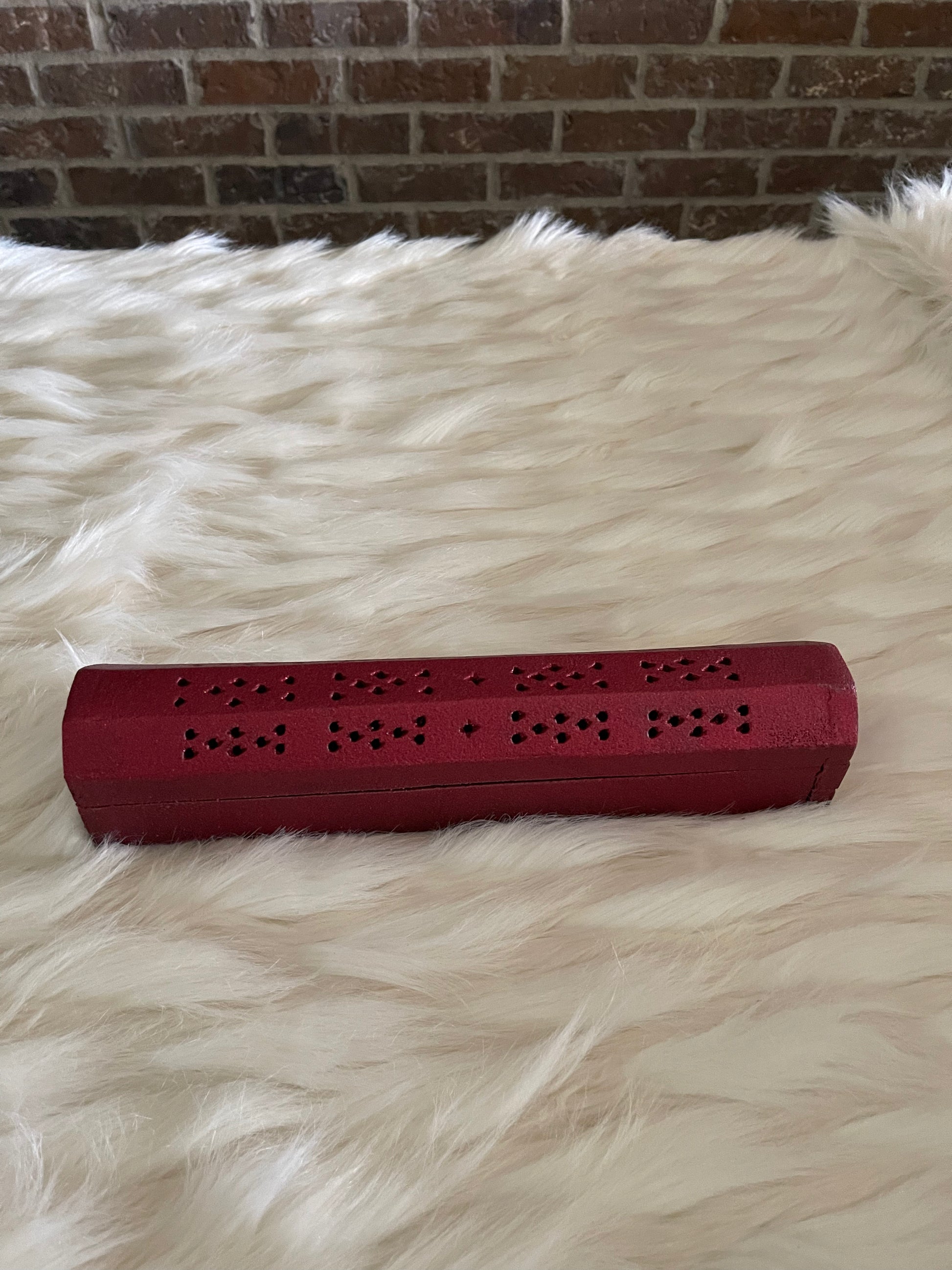 Part of our “Home Accessories” Collection. Meditate in style. Accessorize your meditation. This incense box is for sticks and two cones. 6 cones and 10 sticks are included with purchase (random scents). Color as shown. Approximately 11.5 inches long.