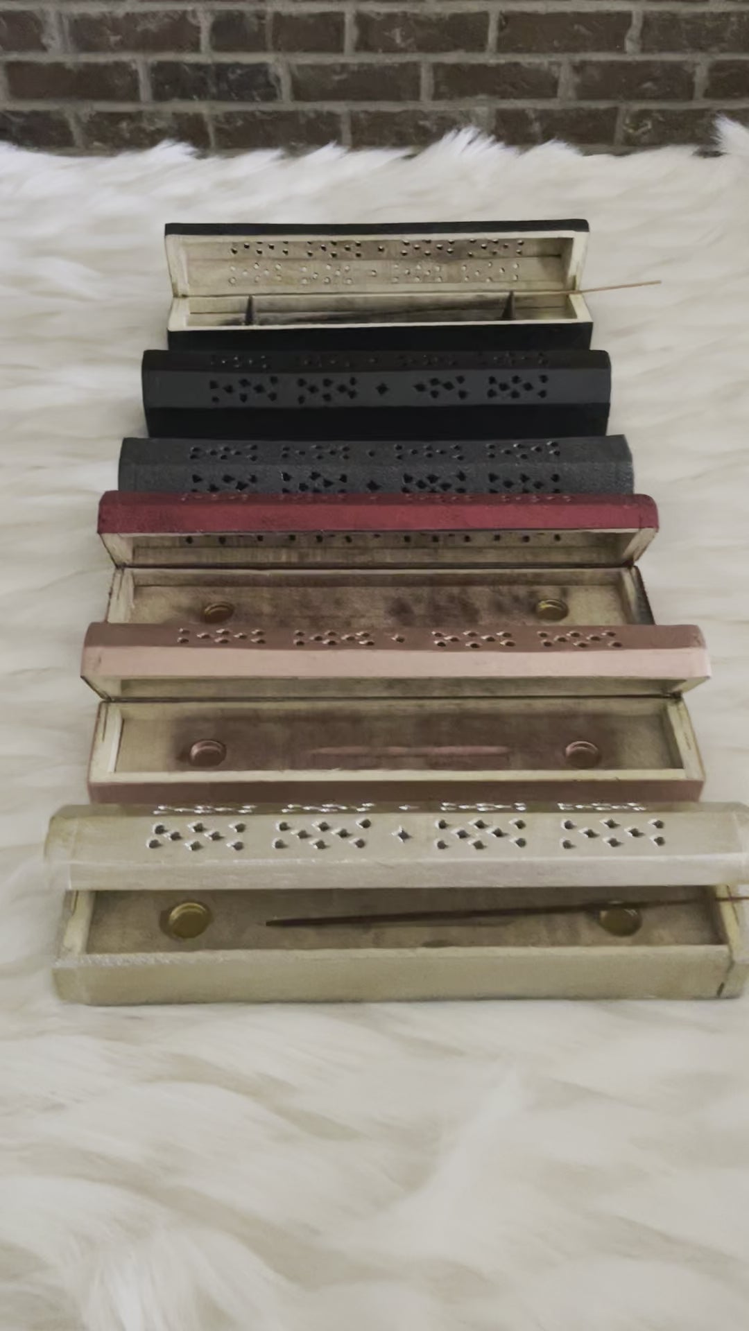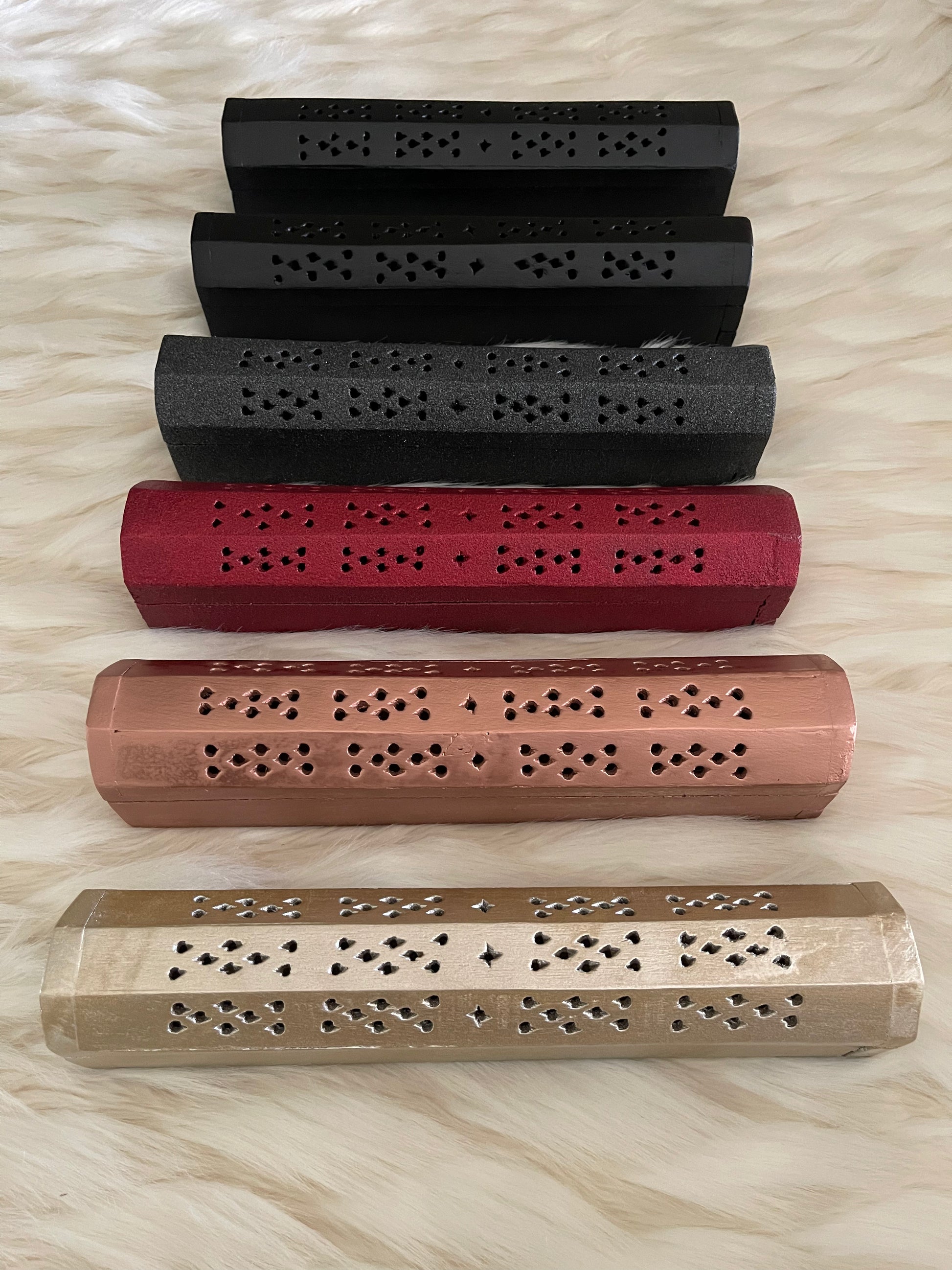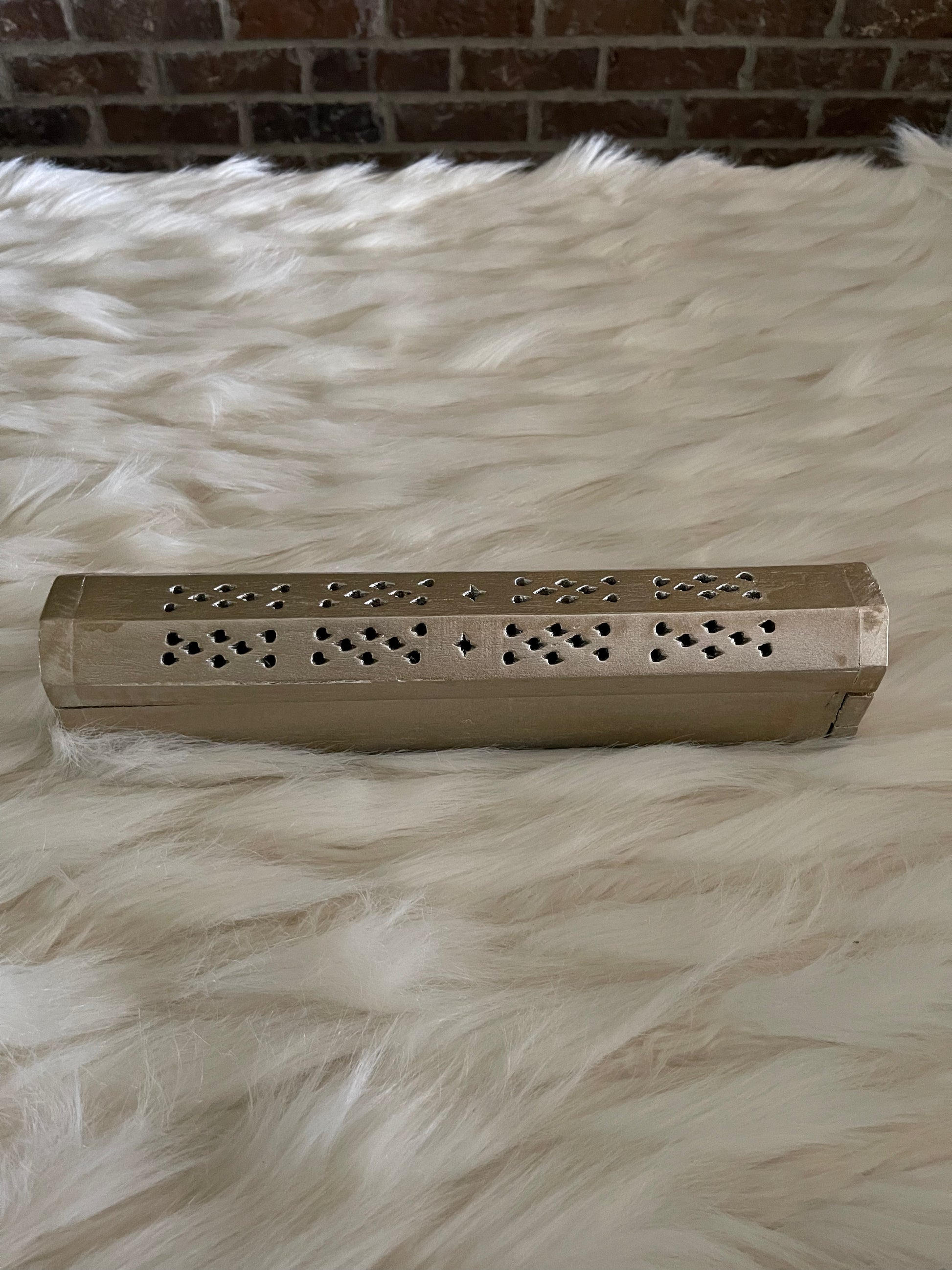 Part of our “Home Accessories” Collection. Meditate in style. Accessorize your meditation. This incense box is for sticks and two cones. 6 cones and 10 sticks are included with purchase (random scents). Color as shown. Approximately 11.5 inches long.