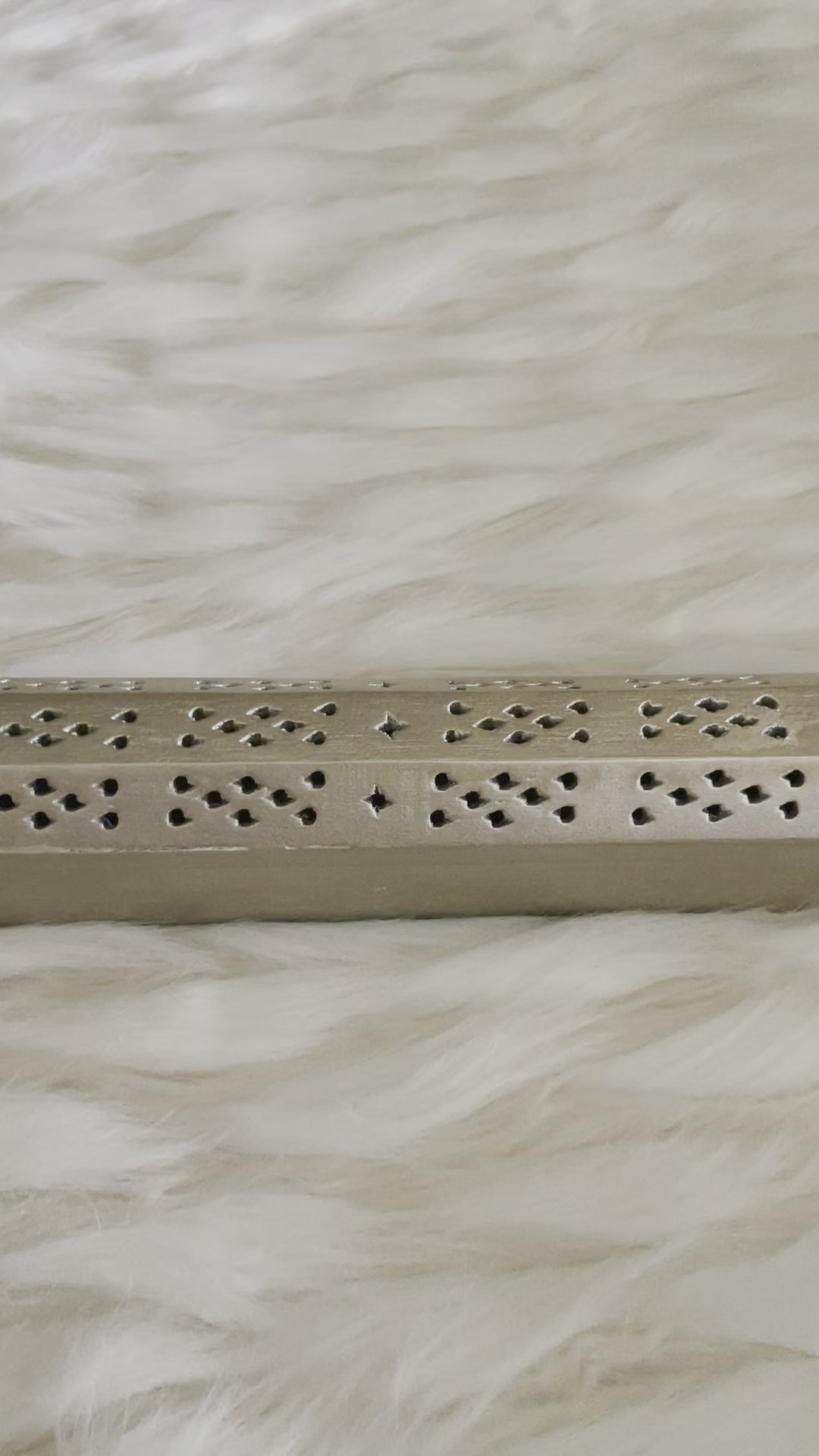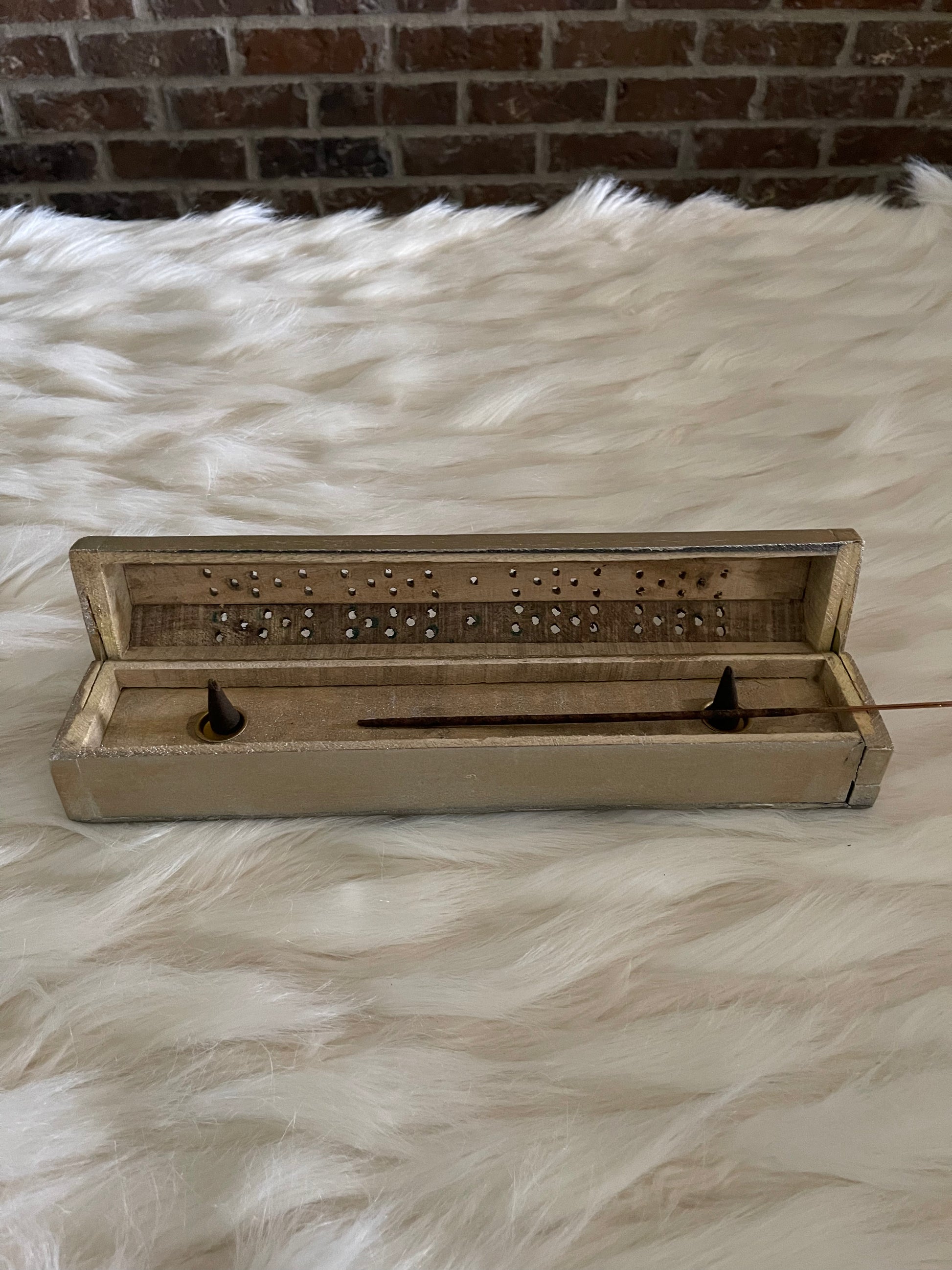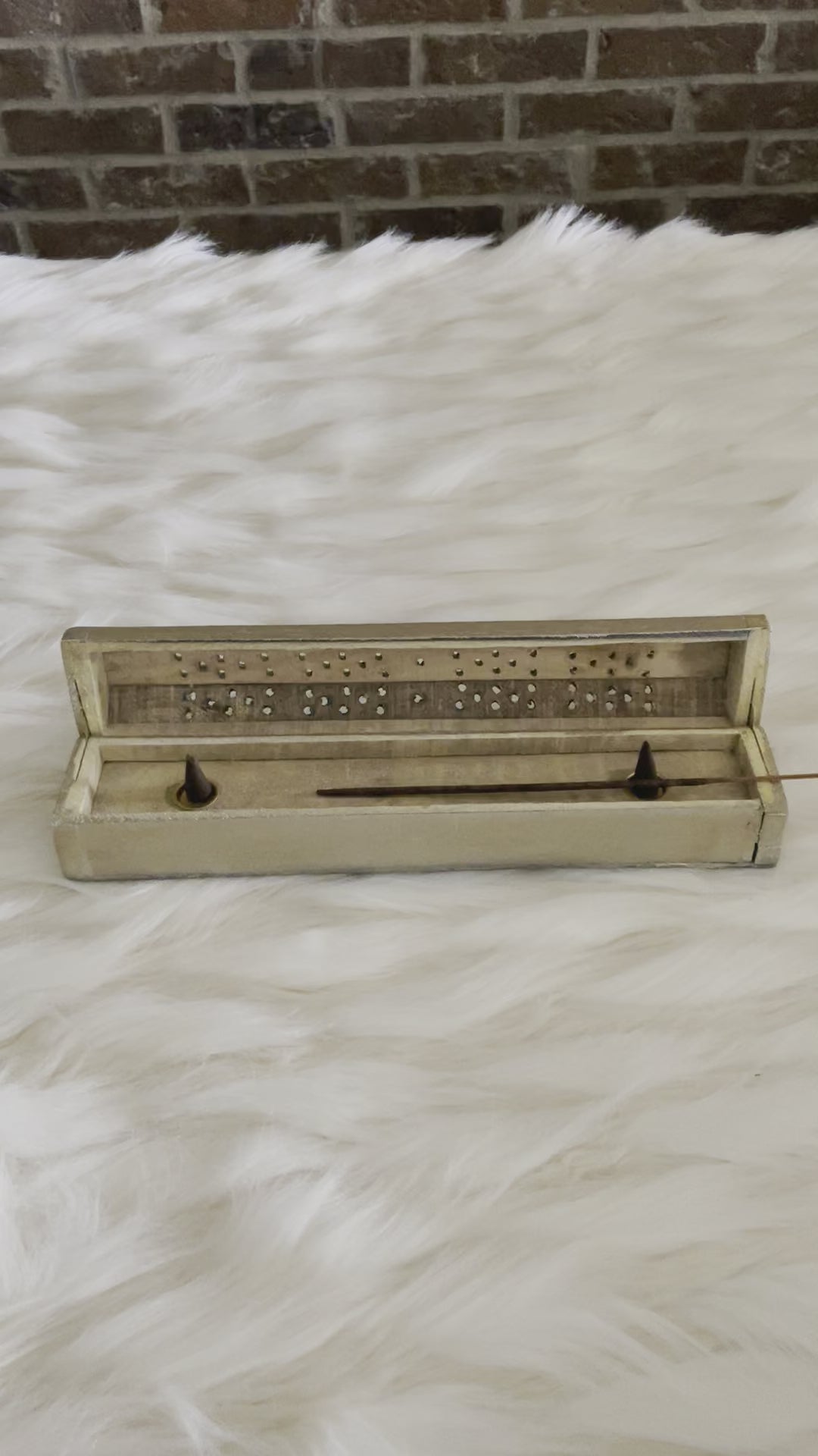 Part of our “Home Accessories” Collection. Meditate in style. Accessorize your meditation. This incense box is for sticks and two cones. 6 cones and 10 sticks are included with purchase (random scents). Color as shown. Approximately 11.5 inches long.